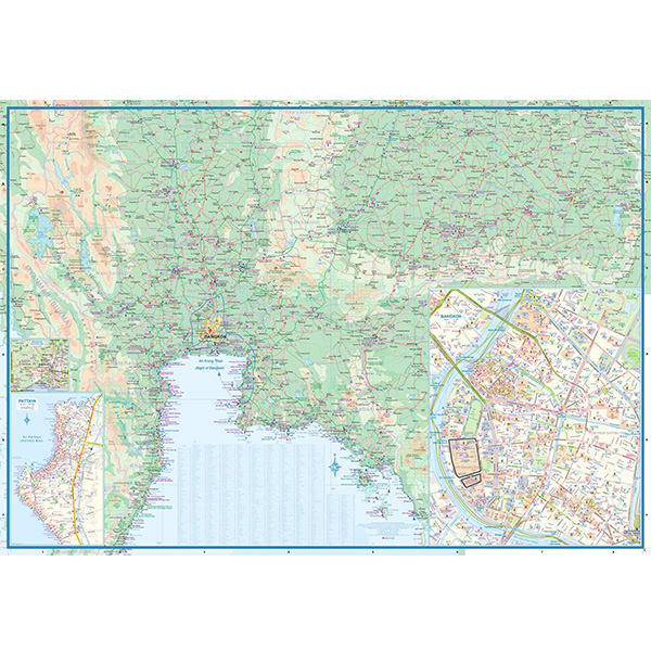 The map actually goes from Bangkok north, and side one includes a very good inset map of Bangkok’s central area. Probably the most interesting spot on this side is the town of Kanchanaburi, which is within easy striking distance of Bangkok. This was the site made famous by the war movie Bridge on the River Kwai (now Khwae) on the Japanese-built Burma Railway. The current bridge is not the original, but the Commonwealth Graves Cemetery is well worth a visit. The other side concentrates on the wilder portion of Thailand, the far north. All known points of interest have been included, including a lovely inset map of Chiang Mai, the focal point of the north. The rail line ends here, but if the city’s many temples and pagodas don’t overwhelm you, tours to nearby temple sites abound. The temple complex near Phrae, further to the east, are also shown, as is the highway leading to Chiang Rai in the far north.
